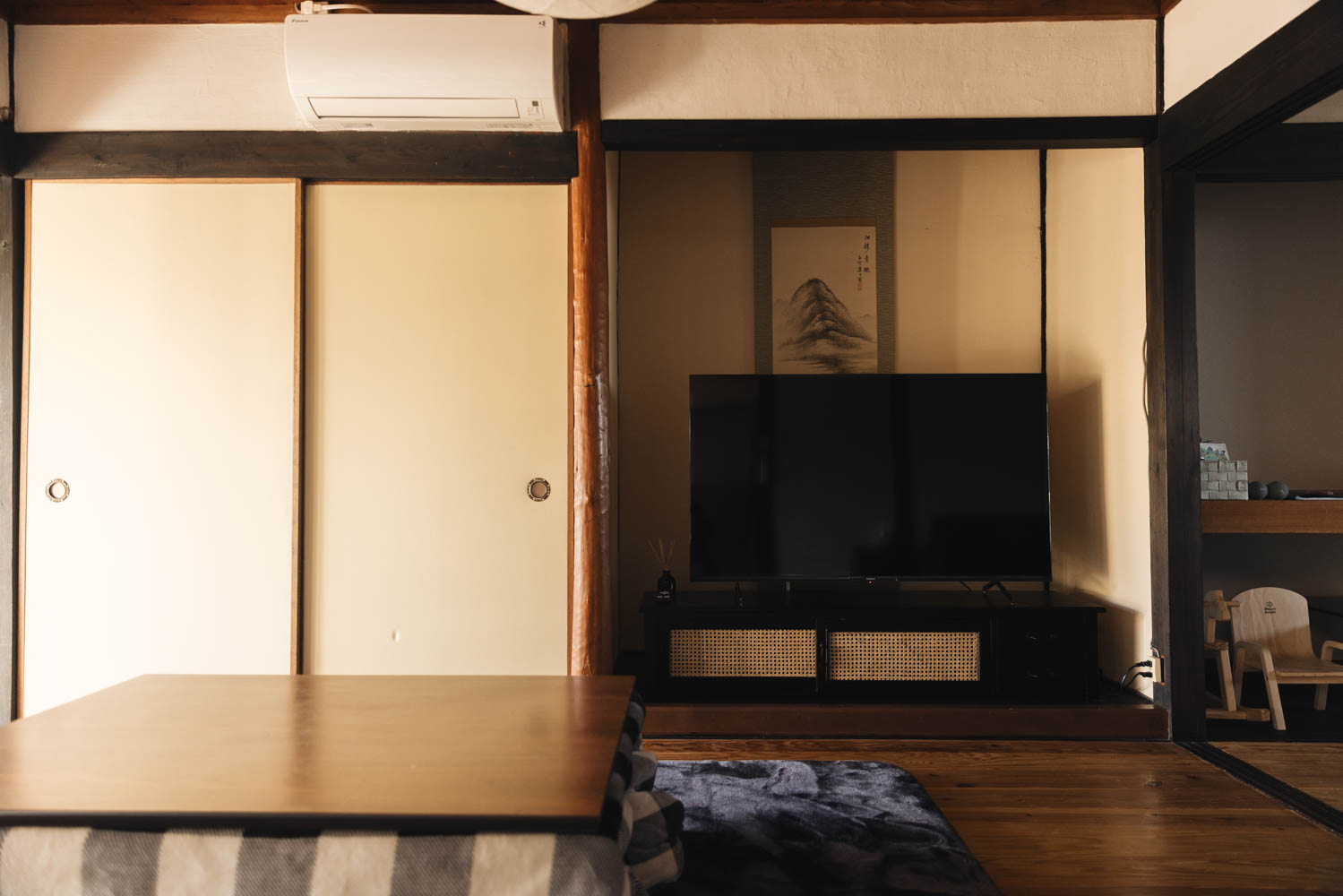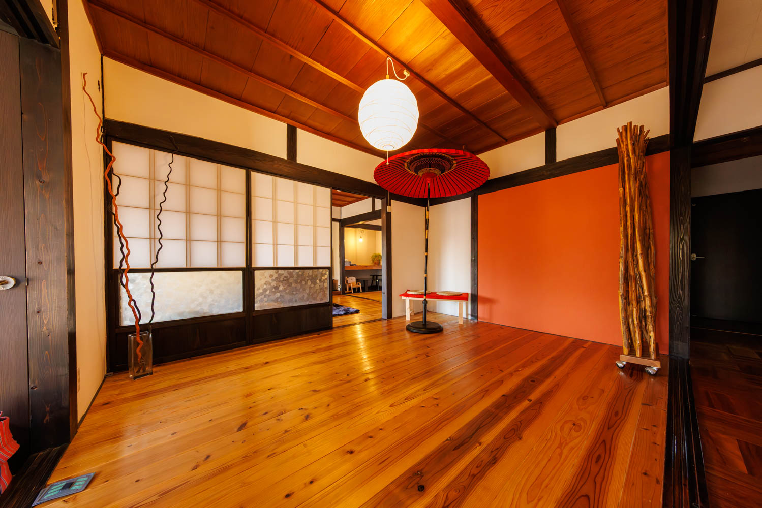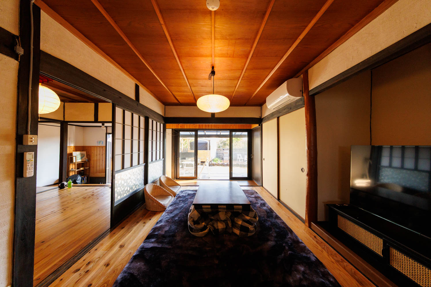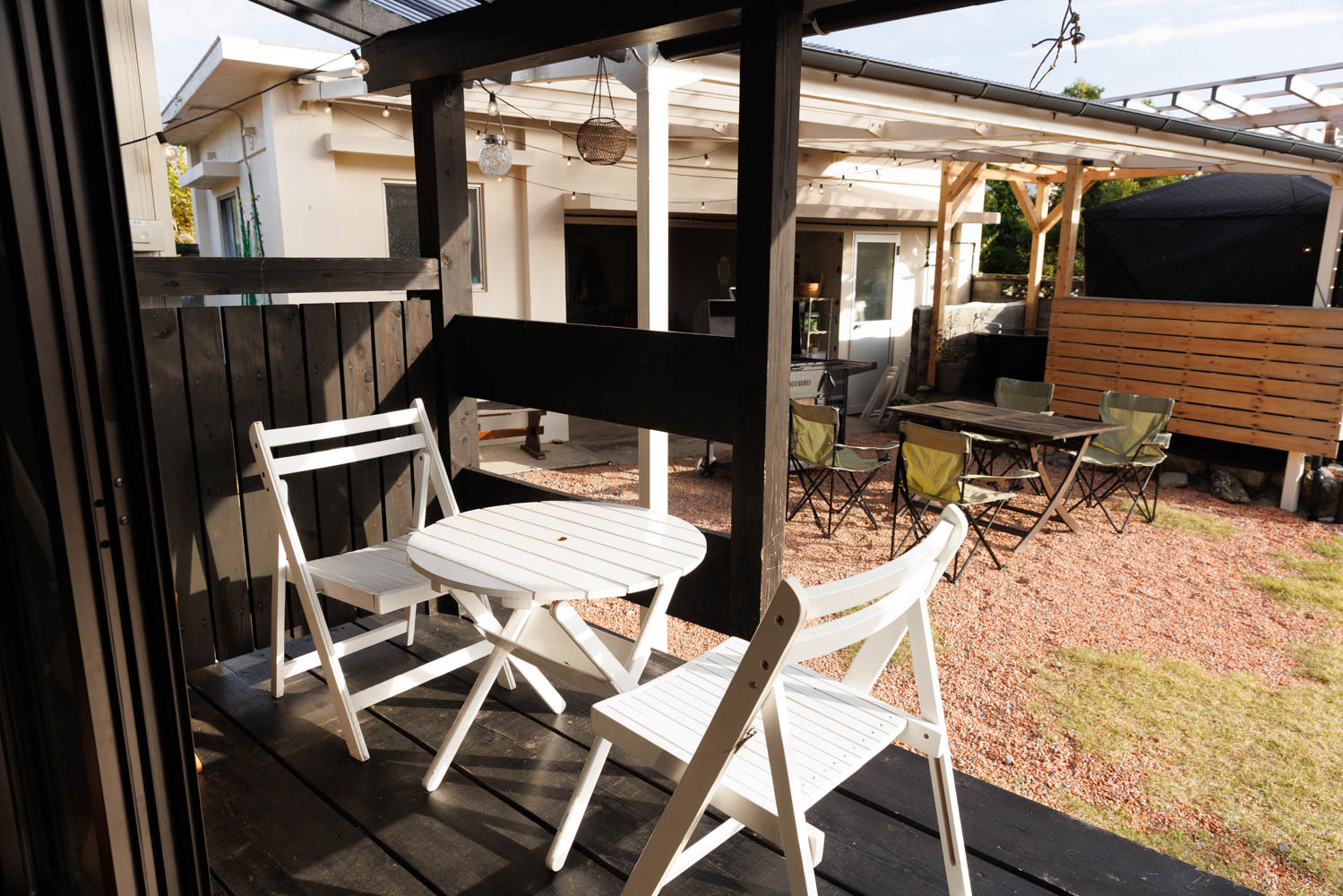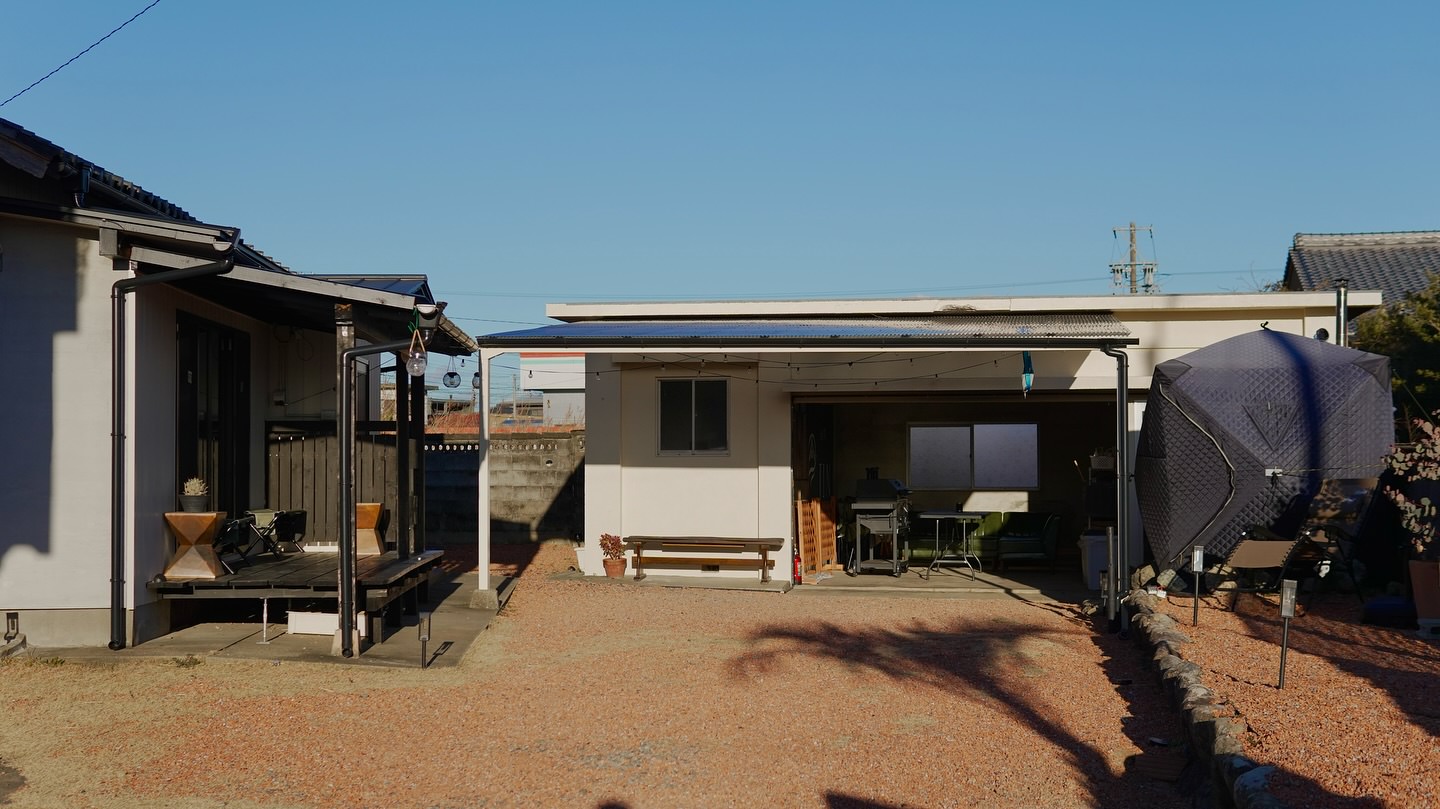 和の趣はそのままに、家族や仲間と、肩の力を抜いて過ごせる宿です。外には屋根付きBBQテラスと薪サウナ。雨の日はシアタールームで映画を。
